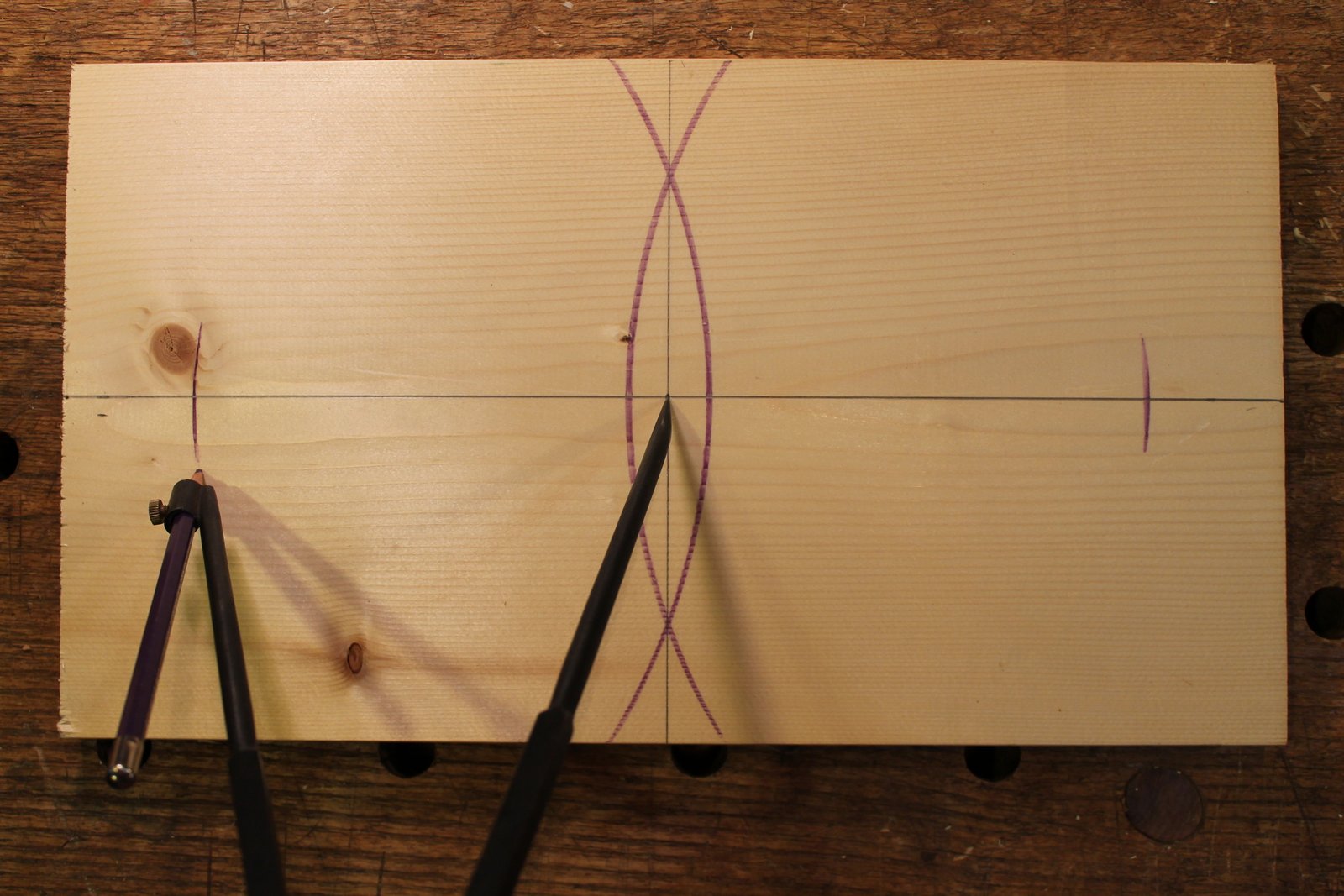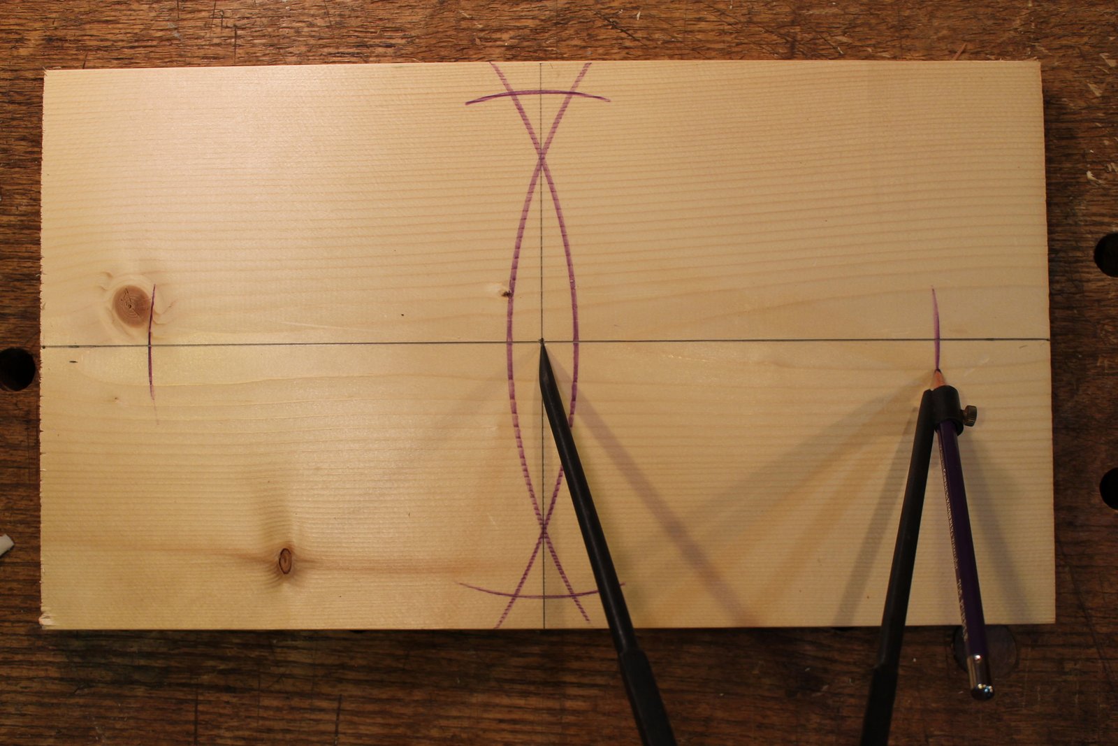 Keep that compass setting (one half of the length), place the point of the compass where the width mark intersects the vertical center line, and strike an arc at the two spots it crosses the horizontal center line. Repeat from the opposite side if you want to be sure.