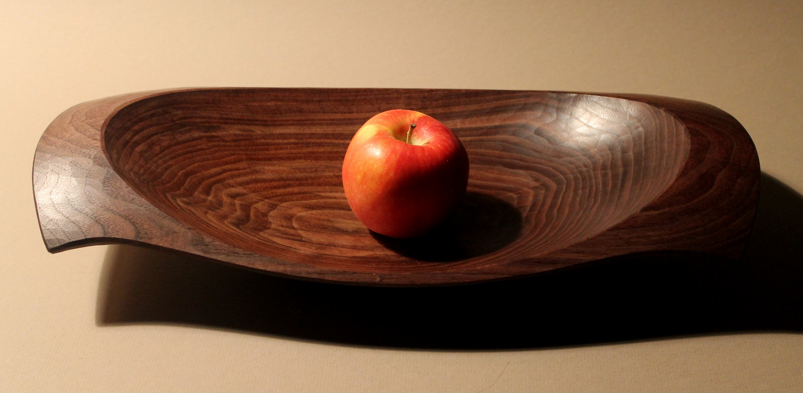 I shot some photos of a recently finished walnut bowl tonight. I included the apple for a sense of scale. This is a shallower bowl than usual, but it still allows room for some dimension and interesting curves. I’ve just posted it on the website, too.