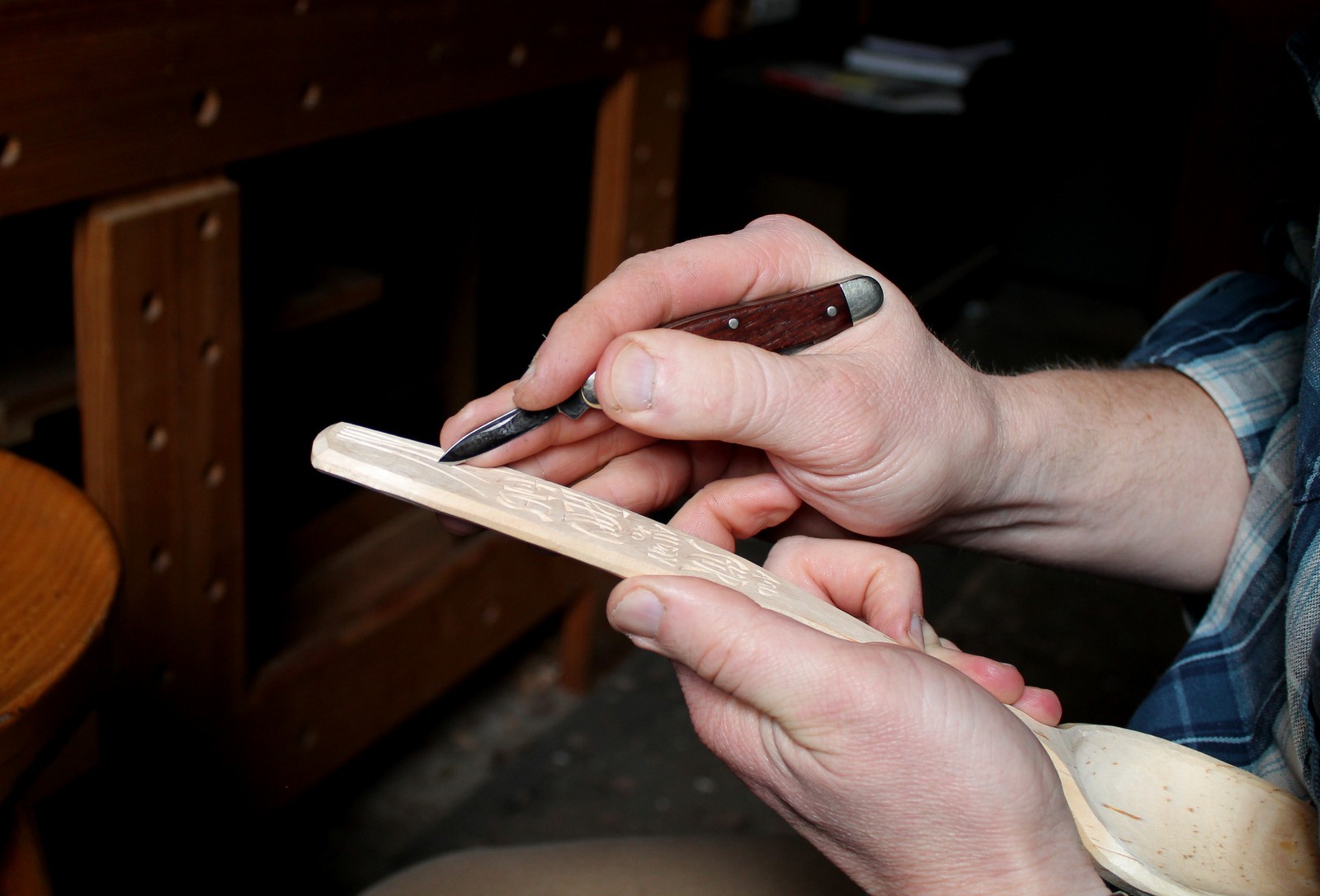 In the photo above, I’m using the grip and knife with which I do just about all small lettering and incised decoration, especially on spoon handles and bowl bottoms.  Whether for the lines of a letter or a tree branch, the method consists of making two slanted cuts that meet at the bottom to form a v-cut.  Sometimes I will vary the grip a little, raising the blade more for tighter curves.  Regardless, I always pull the blade rather than push it.  I use the movement of my shoulders rather than fingers to do the work, and the spoon moves as much as the knife.  They are like dance partners.