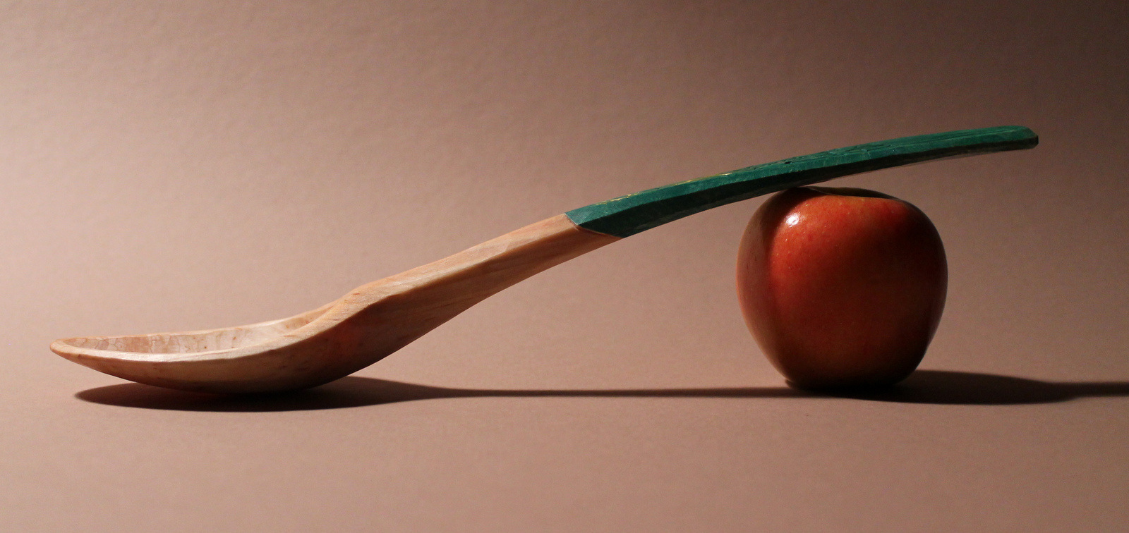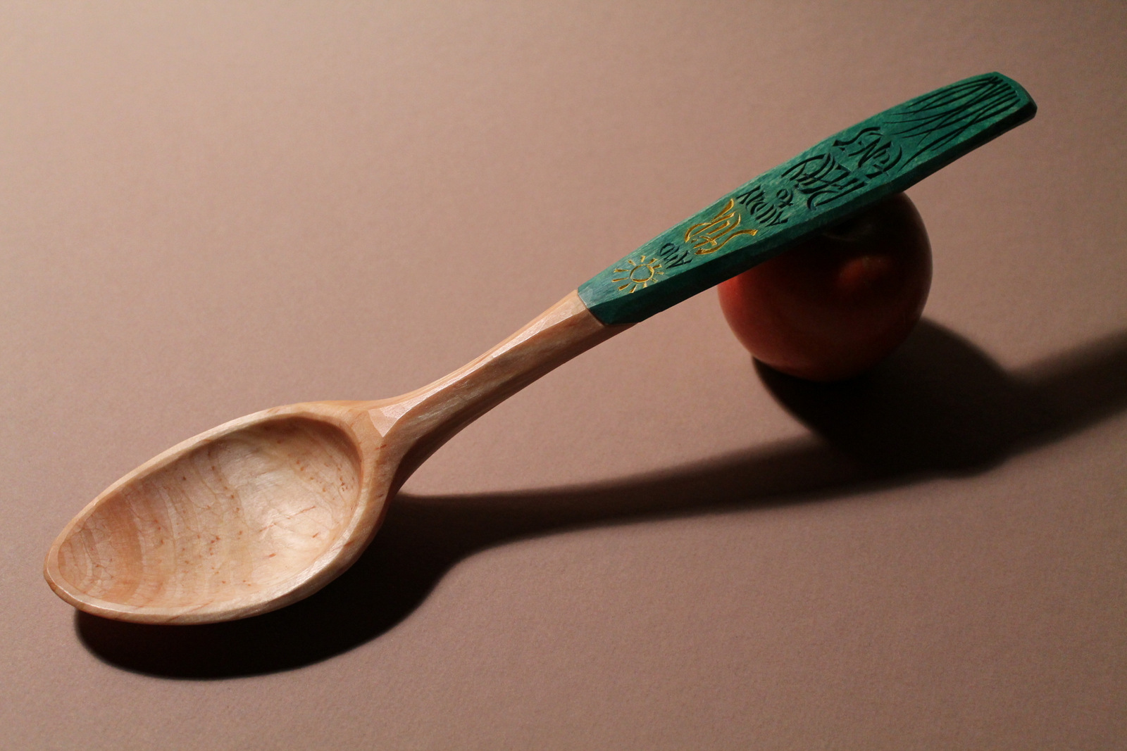 Spring has inspired me to be a little colorful, like with this birch spoon I’ve just finished. After carving the words, I diluted some mixed artist’s oil paints with a little citrus thinner and applied it to the handle like a stain. The letters naturally appear darker. After that dried, I painted the sun and “stir” with a golden color. Once dry, the entire spoon was soaked in flax oil for a couple days.