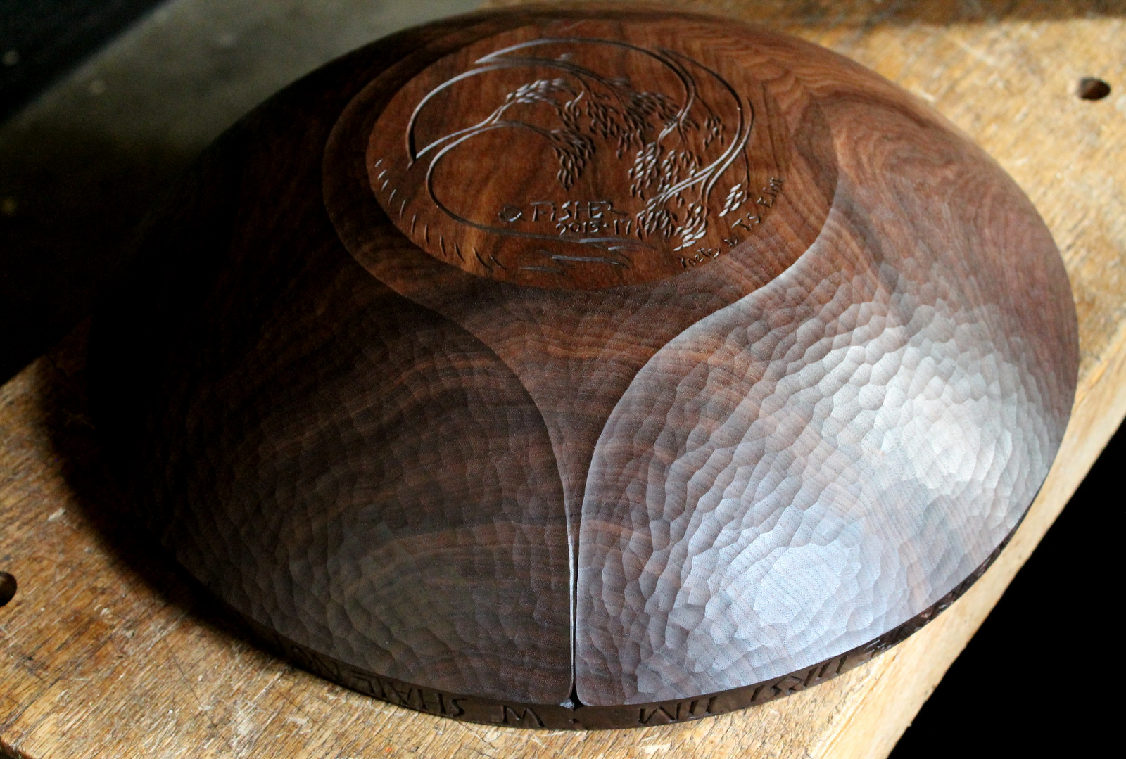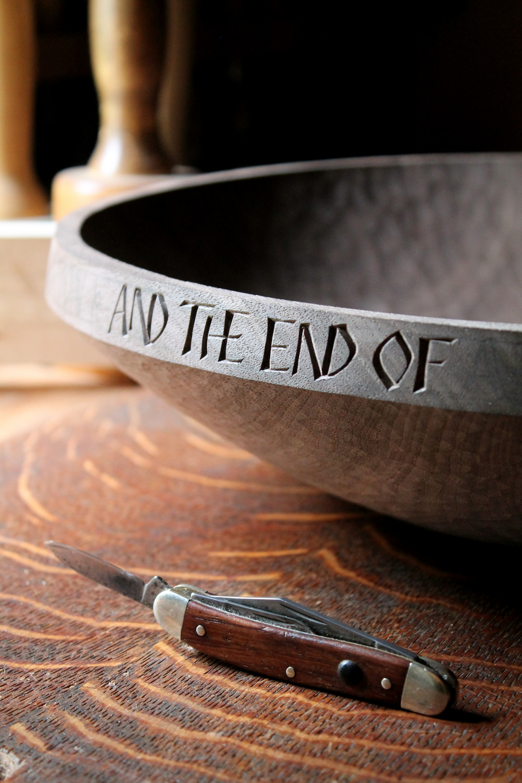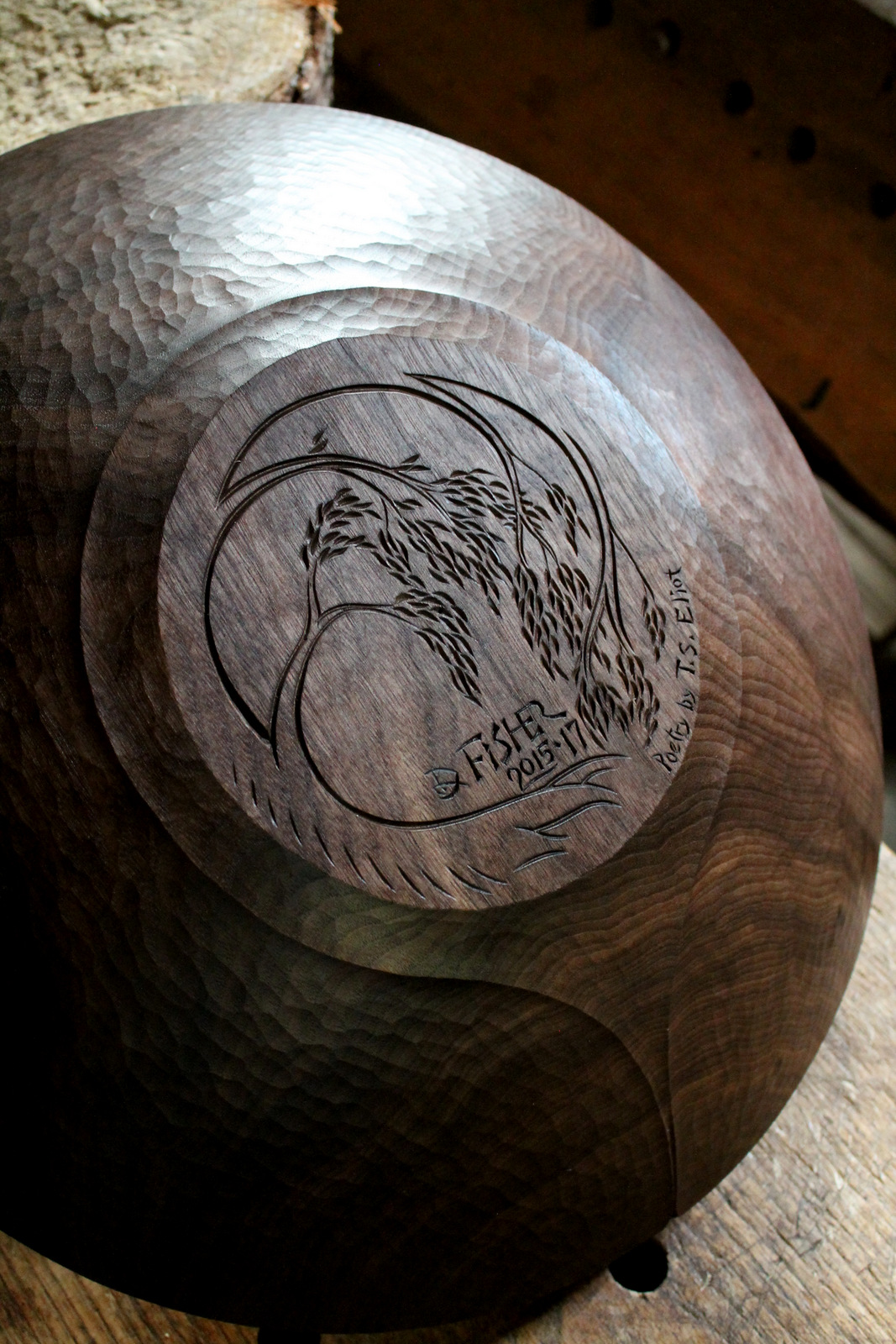 As I wondered over Eliot’s writing (the wheels in my head turn slowly), I kept returning to the four lines above, and I designed this walnut bowl as a fitting setting for his words. Through the layout of the words themselves, the path of the raised ridge along the underside of the bowl, and even the tree on the bottom, I hope the piece reflects return and renewal.