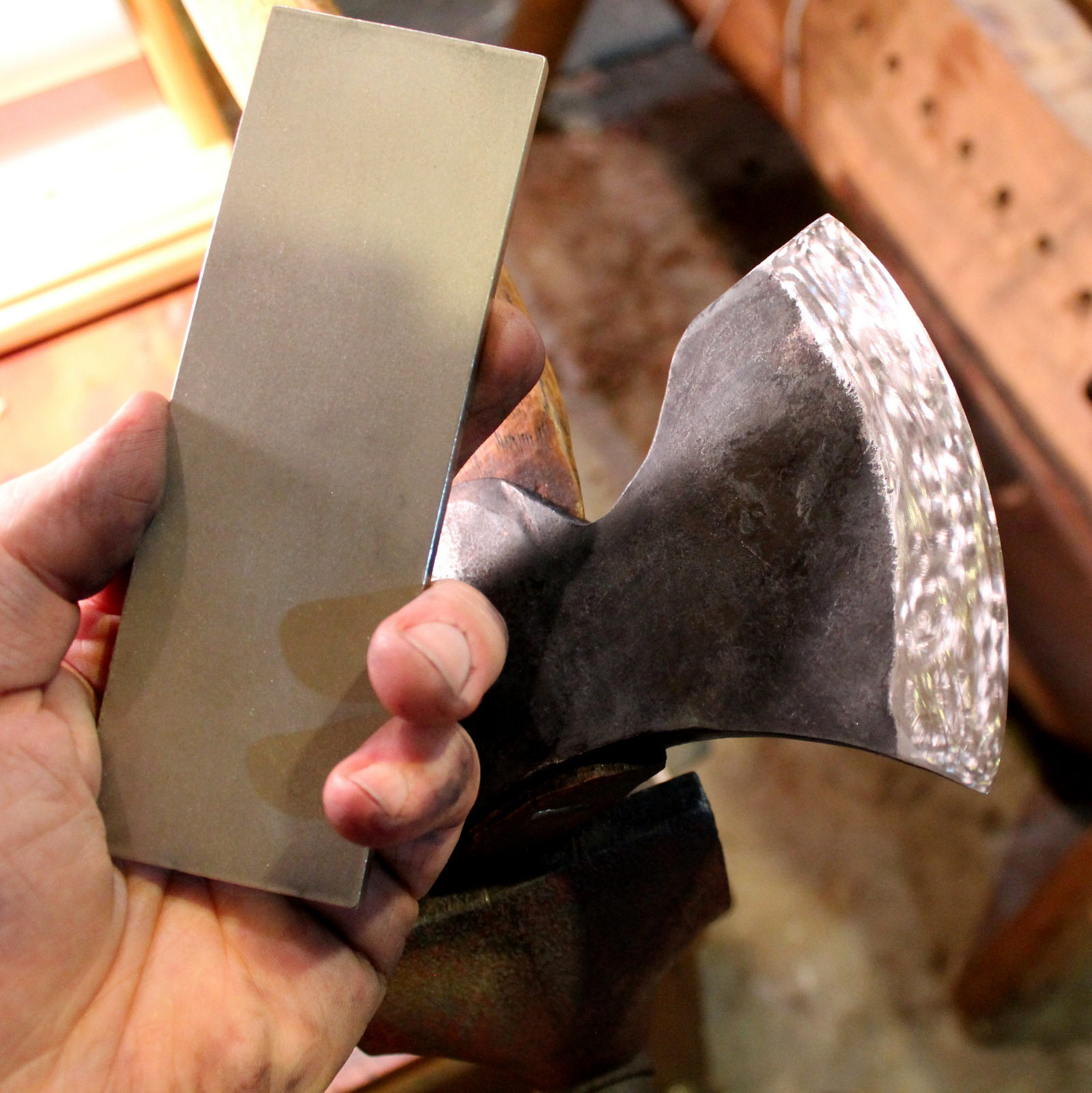 A 2×6 dia-sharp “stone”. This view shows the left bevel of the carving axe.