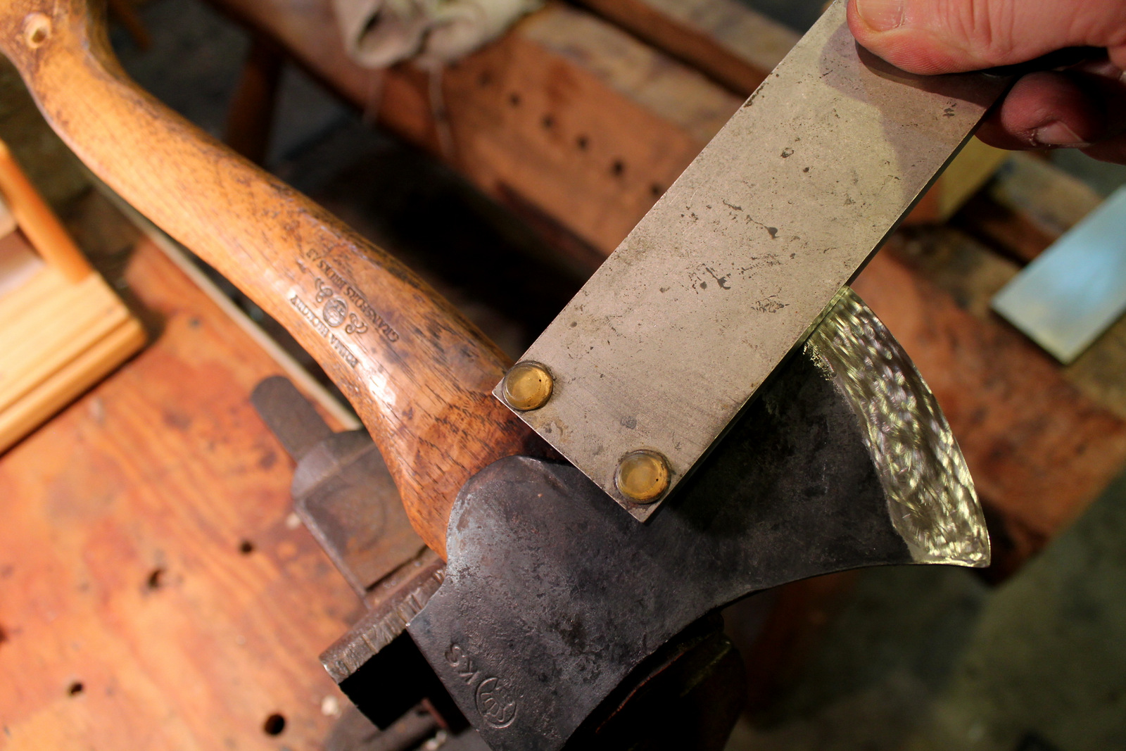 I usually finish with a very smooth white ceramic stone to polish the edge and remove the fine wire edge.  For this, I remove the axe from the vise, holding it in my left hand so that I can see when the stone is flat on the bevel.  I begin with the stone contacting the back of the bevel, then lower it until it just touches the edge.