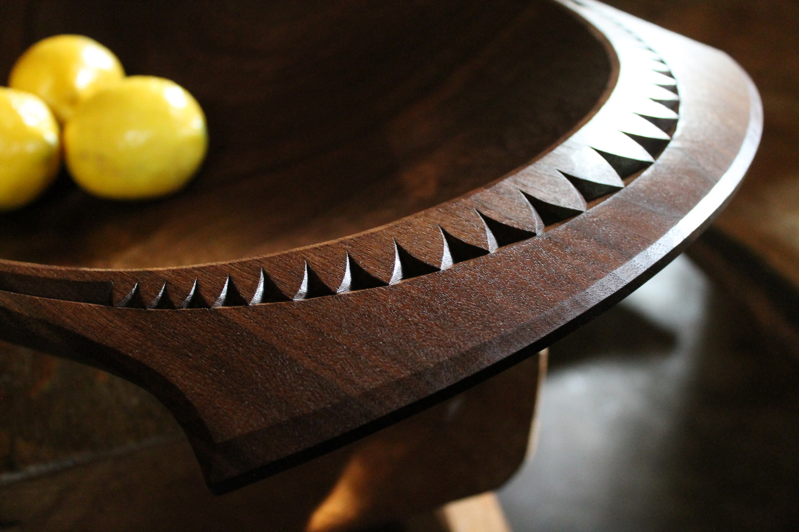 Dave, I love the way you finished it, both with the ridge lines on the bottom and the arches on the top. The arches are a wonderful variation on your diamonds, and beautifully executed. My wife said they look like petals. Really well done, inspiring! I’m going to hunt some walnut… 😉