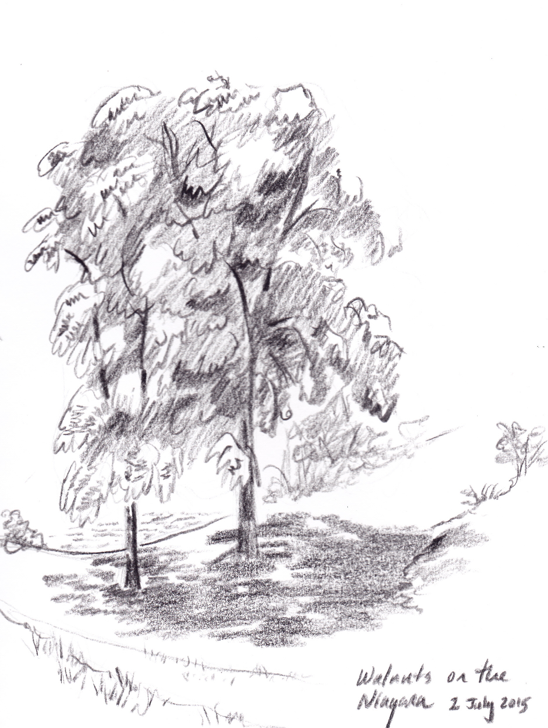 Last week, I spent some time along the Niagara River. I saw the Falls again (I live only three hours away), and they are still thrilling. But what I noticed more than ever before were the beautiful trees on my walks around, especially the abundance of lovely walnut trees. They are stately like oaks, yet softened by their long slender leaf stalks drooping like willows, the leaflets fluttering in the breeze.