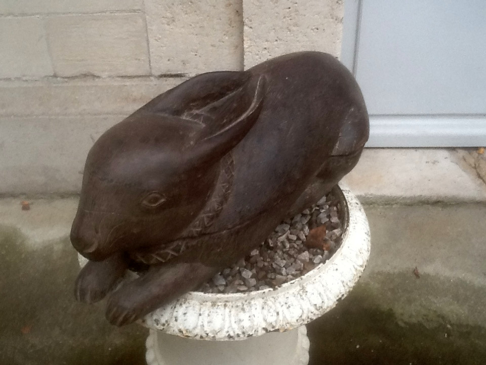 A friend recently sent me a couple photos of this piece he discovered in a chateau outside of Paris. About two feet long, it has been carefully carved, right down to the collar around the neck. The hollowed upper half lifts off to reveal a lower portion carved into two storage areas. A careful look at the bottom half reveals that this rabbit has a rabbet. I have no photo to show it, but the upper half must have a corresponding rabbet carved along it’s inner rim.