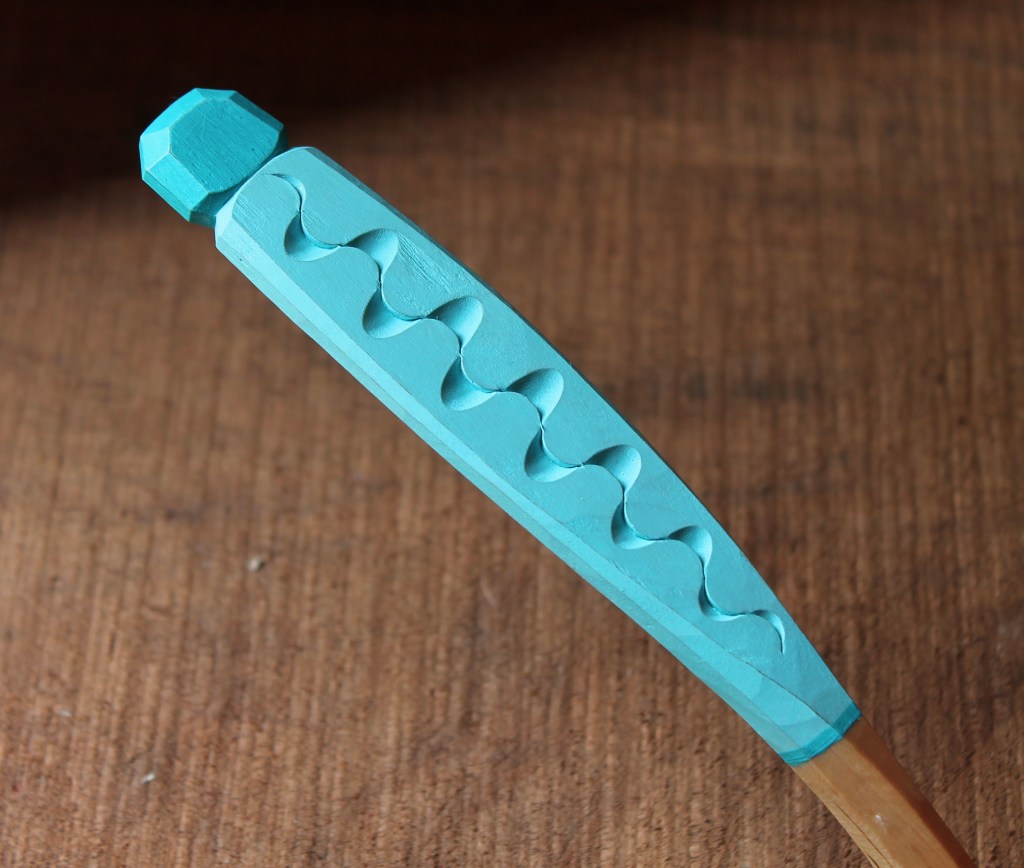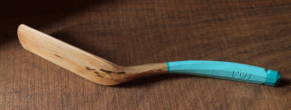 #6: Cherry (sapwood) serving spatula. Narrow width suitable for serving cake or brownies. 12 5/8″ x 3 1/2″. This cherry crook had the perfect lines for this piece. The fibers run true through the handle, neck, and blade. I carved a (wave?) pattern into the handle and painted with artist oils. $110 includes shipping. SOLD