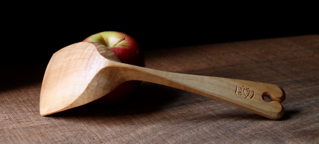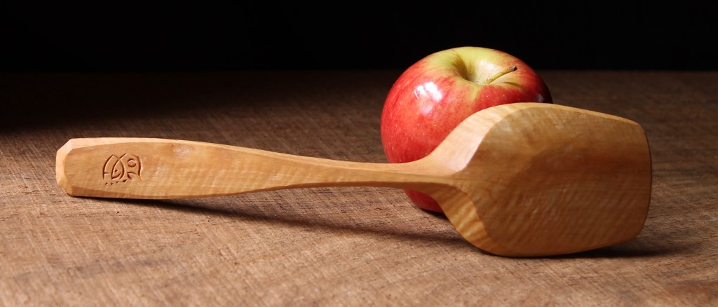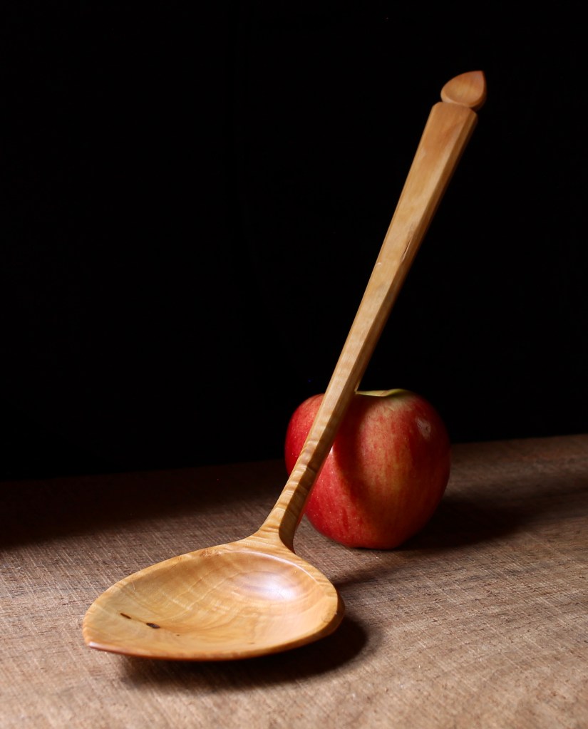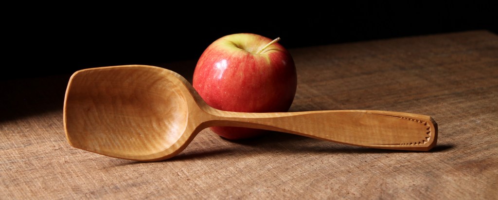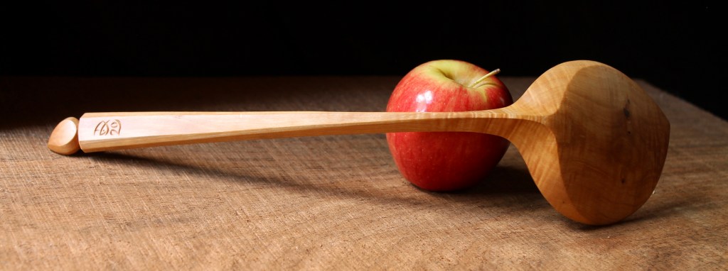 #3: Norway maple server. 13 3/4″ x 3 1/2.” This serving spoon can come in from a high angle. The design at the back of the wide handle was spur-of-the-moment. Sort of a negative finial I guess, and can serve as a hanging hole. I would call it the uvula spoon, but that might hurt its chances of selling. This Norway maple is hard stuff, especially in the crooks. $120 includes shipping. SOLD
