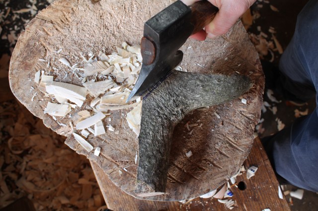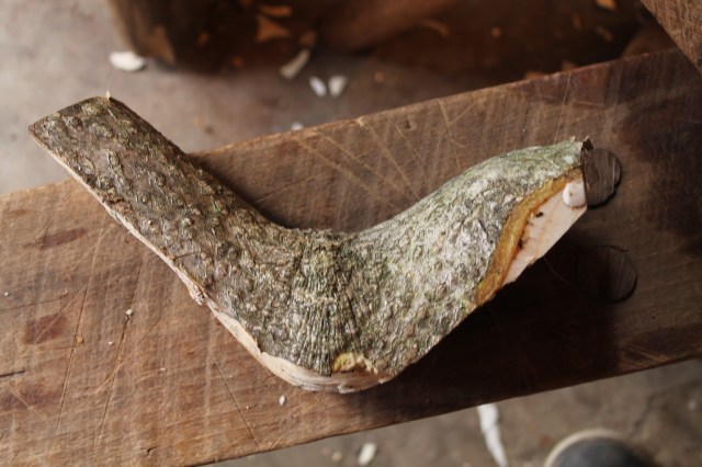 I set the crook on its side and try to envision the way the bird will “sit”. Then I sketch a line for the bottom and hew away the roundness of the split surface by hewing across the grain.