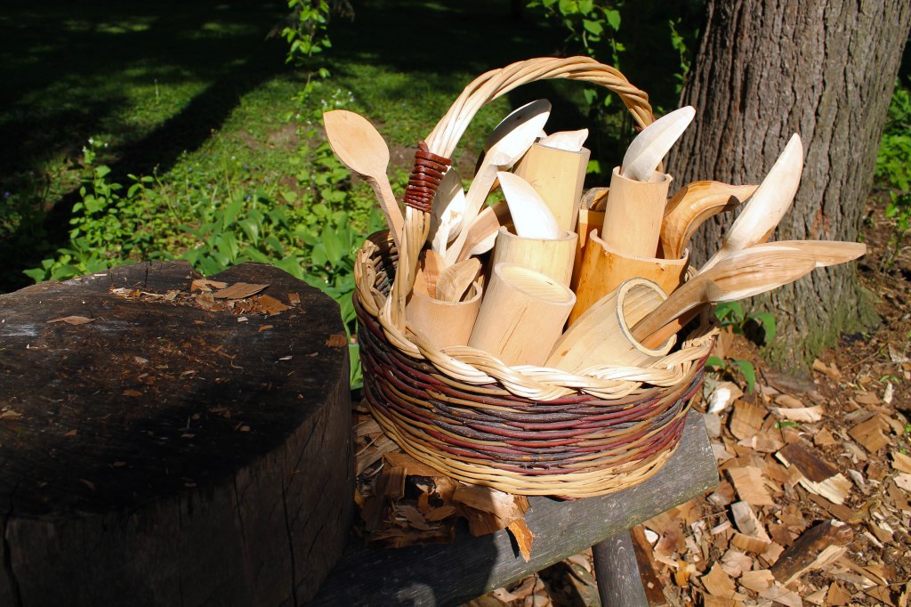 We just had our first full week of summer-like weather, and it had me outside working and preparing some material for some of the projects I’m looking forward to. Some of them are in that willow basket waiting for the next carving stages: shrink pots, spoons, bird bowls….and plenty of other projects that won’t fit in the basket.