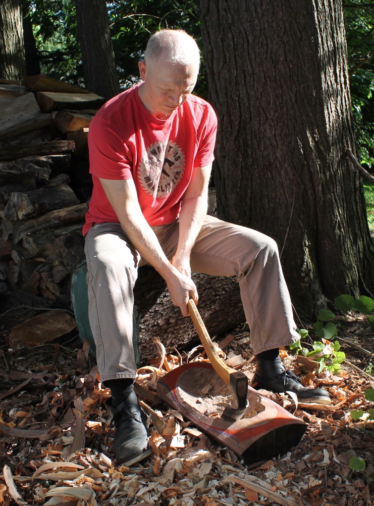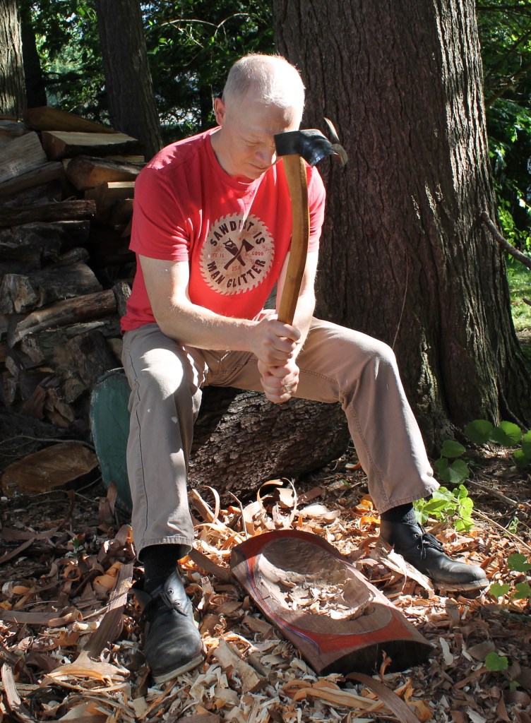 Although I rarely use it, I do have a hollowing adze meant to be swung with two hands. For large bowls, it can help to hog out material a little faster. It was looking lonely, so I pulled it off the wall to begin hollowing the walnut bowl that led my last post. In his book Country Woodcraft Then and Now, Drew Langsner has an extensive bowl carving section that includes a low base for securing a blank while using an adze with two hands. That would be better, but I haven’t gotten around to making one, so I just took a seat on a convenient log and set the heavy bowl blank in front of me. With my elbows on my legs, I swung the adze by pivoting at my elbows and rotating my wrists. The hardest part was concentrating, what with the neighborhood kids laughing at my pants, asking where the flood was.