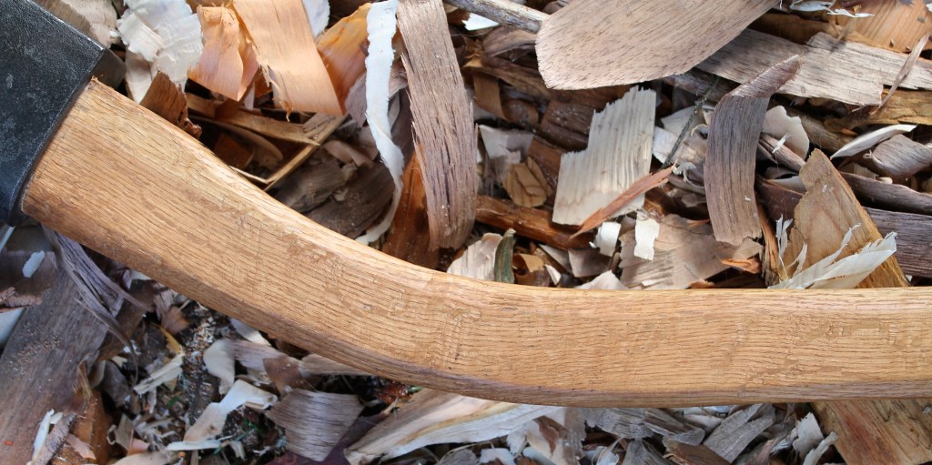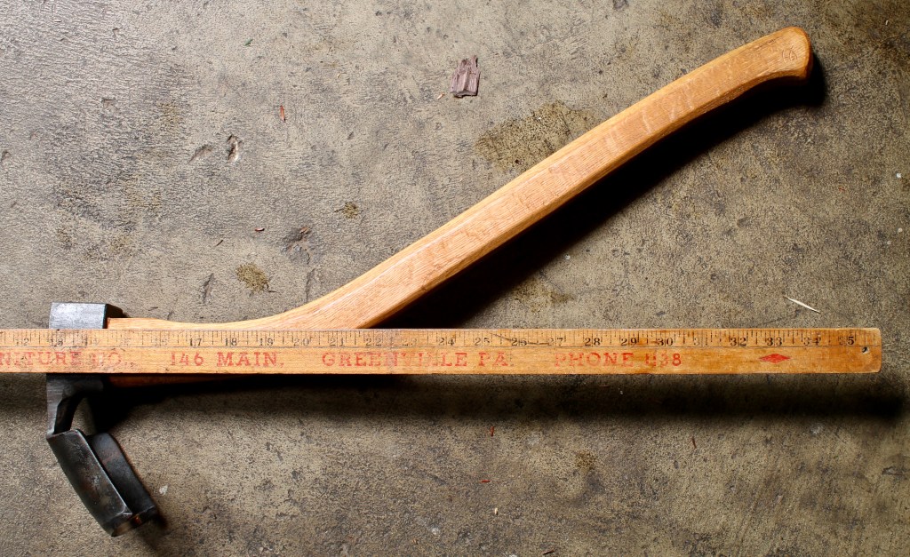 When I bought this adze, I expected I would have to change the handle. The geometry of the head and the handle were not in harmony. In the photo above, I’ve used a yardstick to represent the original handle. It came straight out of the eye. When swung naturally, the cutting edge was tucked at an inward angle and the area behind the edge just slammed into the wood. So it was either reforge the head to open it up with less of a tucked profile, or make a new handle that brought the geometry of the head into harmony with the swing arc. I’m not a blacksmith, so I went to the woods.