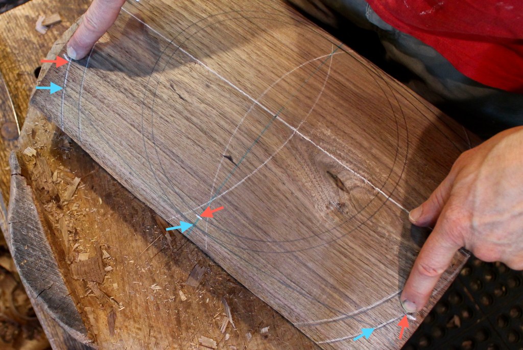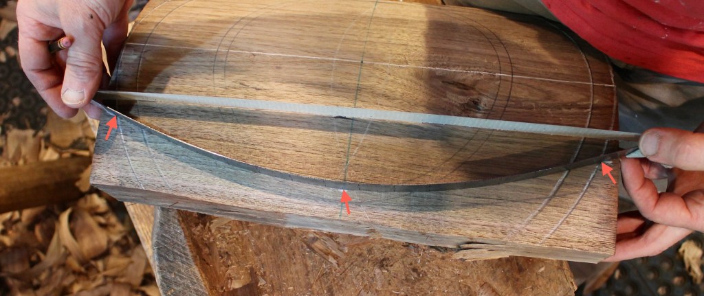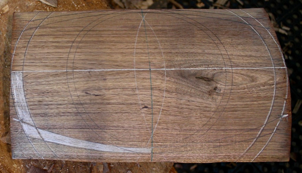 When I lay out the “rectoval” bowls like the walnut bowls featured in my most recent post, I usually simply sketch in the long side curves by hand. On those two bowls, I experimented with a technique using an improvised drawing bow.
