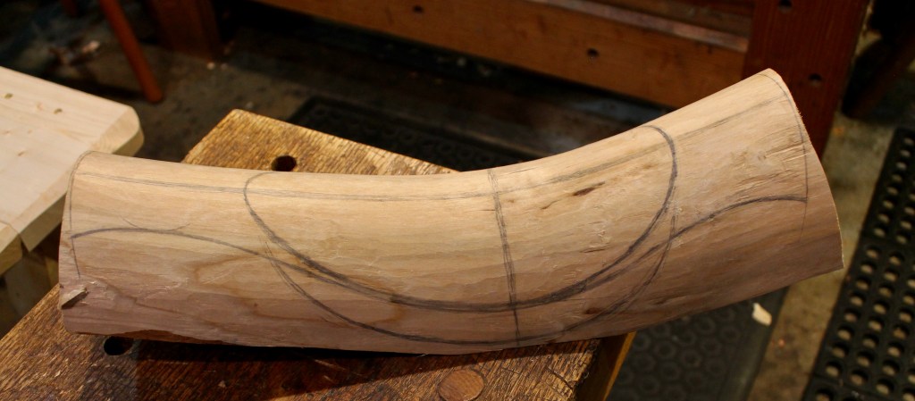 At home, I split off the lower half of the crook, the part with another branch offshoot, and got to thinking. I started to shave off the bark (what a shame to remove those beautiful lichens) and decided to use the flow of the grain in this crook to make an asymmetrical bowl with lifted handles. No straightedge or square for this one; I just sketched freehand with a pencil on the cleanly shaved surface.