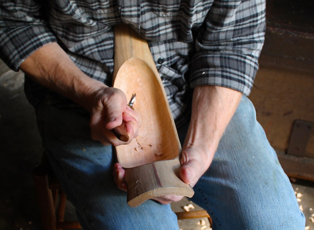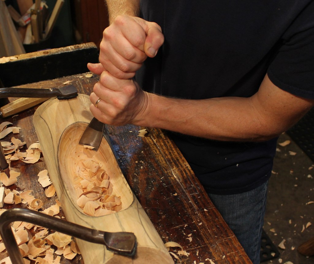 As you can see in the slideshow, I finished shaping the hollow by working across the grain with hook knives. That helped to deal with the subtle grain changes in the crook and to achieve the fullness of the hollow below the rim. In the high-angle shot above, you can see the resulting texture in the hollow. You may also be able to notice that I went with the gentle lateral curve that flowed through the crook.