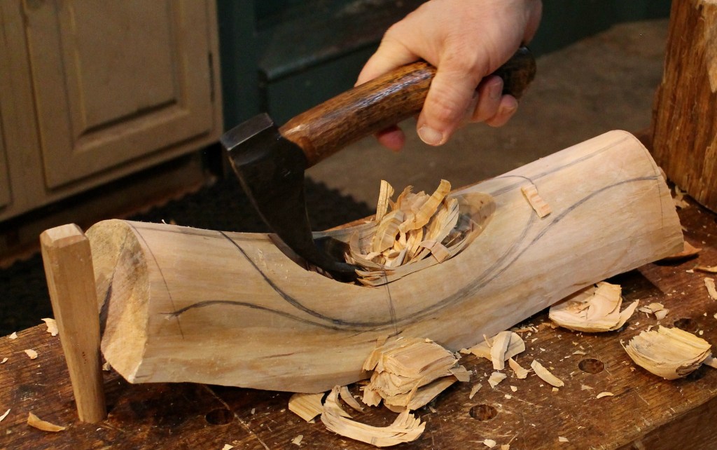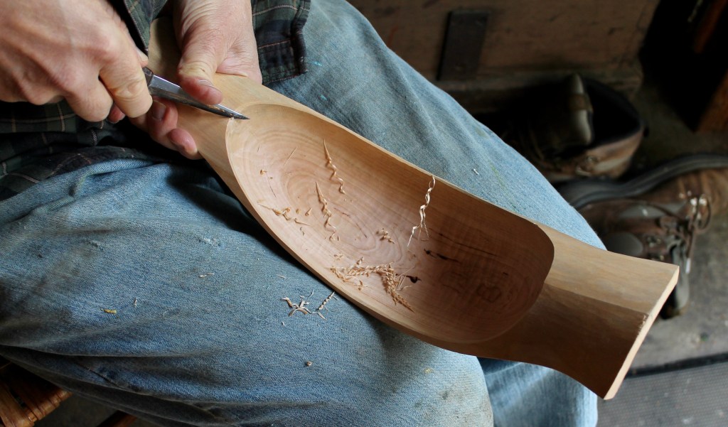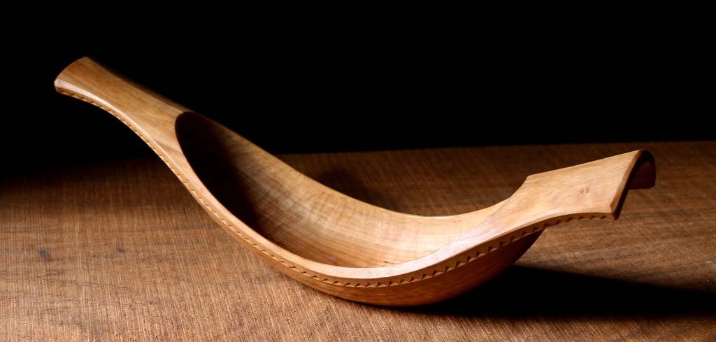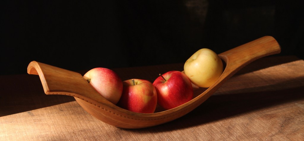 She has used it for several years to hold ripening tomatoes – rather like the apples in you image above – and I see it regularly (and I see a flat Hawthorne burr bowl that I carved for my father- in-law, which holds keys now). It is a modest, small bowl but very thin and white, possibly my best bowl in some ways but I prefer the much bigger ship-shaped bowls I made for own leather tools and another for my son, made to order 😀