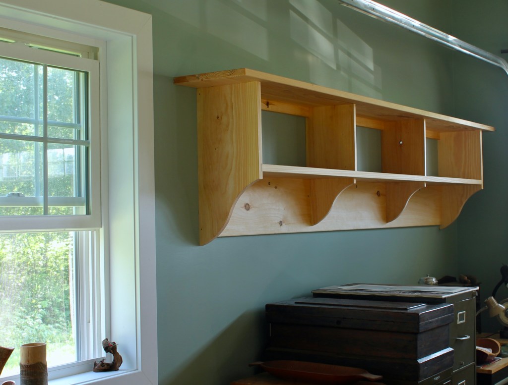 Building two matching shelf units to hang on either side of a central window in the garage/workshop was the first real testing ground for the new workbench. It works, and so do the shelves. I wanted them to hold a full load of books with no sagging. The lower ledger board flat against the wall supports the length of the shelf above and also provides a surface for hanging tools (more on that eventually). It, and the narrower ledger above, also provide anchor points for plenty of strong screws to connect the shelves to the wall framing behind the drywall. The top shelf can hold all sorts of things, including books.