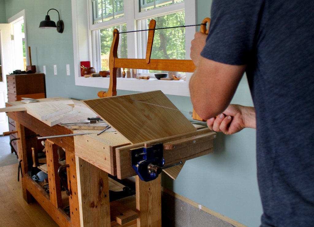 To saw the curved profile of the vertical shelf supports, I put the boards in the end vise. The stability of the length of the bench resists any movement from the motion of the bowsaw. You could, alternatively, extend the board over the edge of the bench top, secure it with holdfasts, and saw vertically.