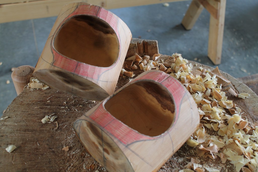 No need for an adze to hollow these. I bored a hole in the center, then worked with gouge and mallet followed by a hook knife.