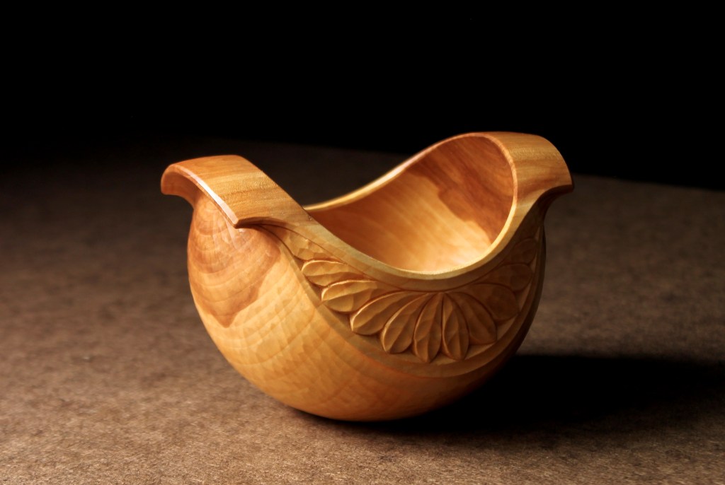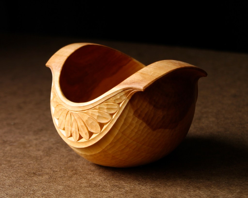 A few months ago, I wrote a post about the early stages of carving this little apple bowl. After it dried, I was trying to sort out how to go about carving the leaf design on the side panel. I referred back to an earlier post showing how I carved the same design on a similar bowl in black walnut and just followed along. There’s a sequence slideshow there.