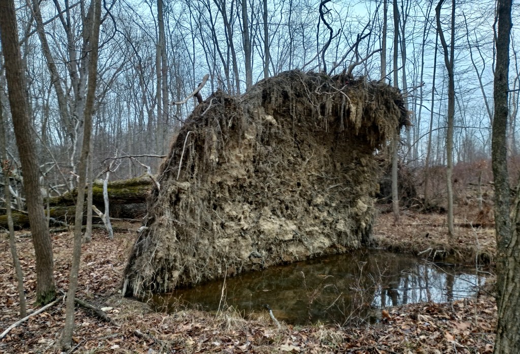 A walk through the woods often makes me stop in my tracks. It may be something as simple as an interesting lichen on a rock or a deer bed. Other times it’s a phenomenal thing like this huge maple uprooted by the wind. I took the photo a couple weeks ago. The top of the root mass is 11 or 12 feet above the ground. It will be interesting to see what little creatures are living in the resulting pool in the spring.