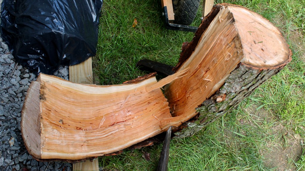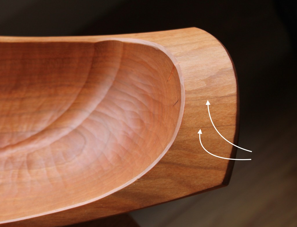Large limbs often have tensions within the fibers as a result of holding so much weight out away from the trunk. So I slow the drying with old cotton sheets and check often. With this one, a couple hairline checks appeared on the narrower handle. I just let a little liquid CA glue (super glue) wick in and that prevented any further issue. If you’re having trouble seeing it in the shot above, I’ve pointed them out below.