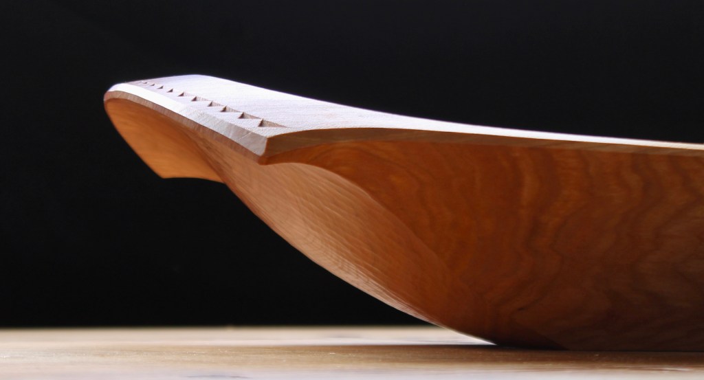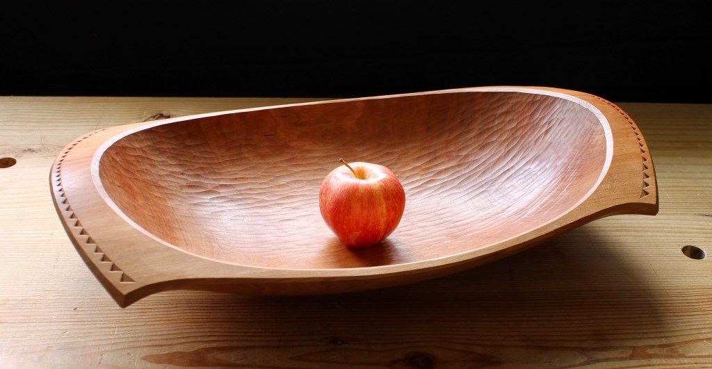 There’s the finished, oiled, bowl from the bottom. There are a few more photos of the bowl below. Of course, being cherry, the color will deepen over time. It’s available for purchase. 18.5″ long x 10.5″ wide x 4″ high. If you’re interested, email me at dandkfish@gmail.com. $975 includes shipping. SOLD Thanks for looking.