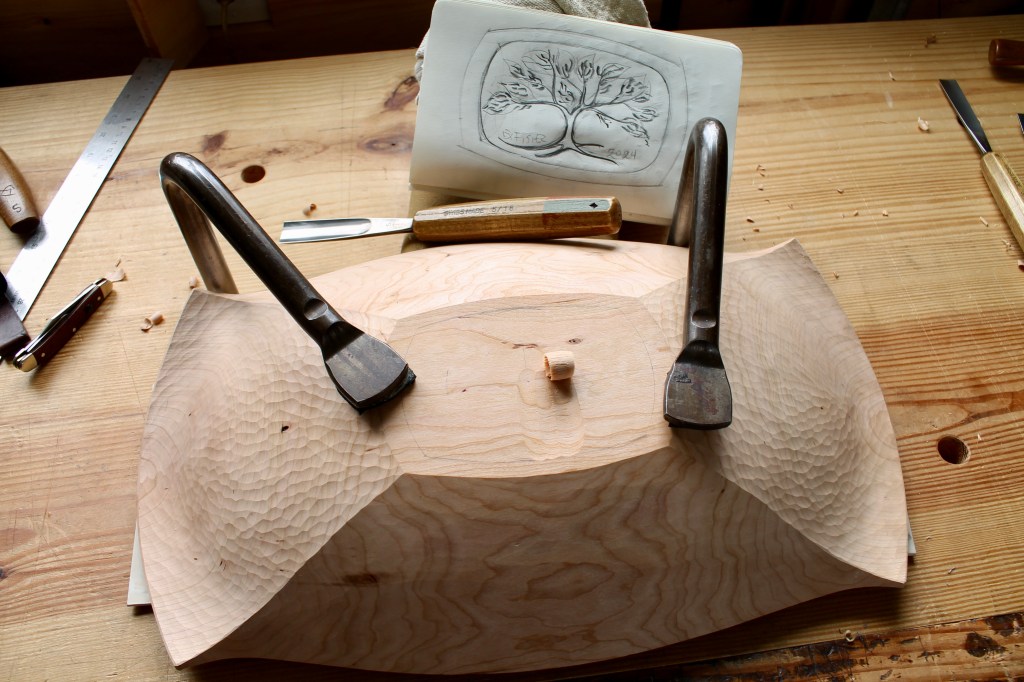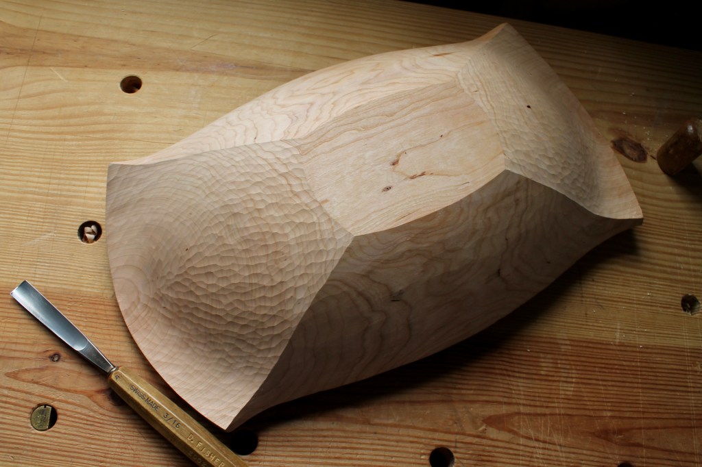 For this bowl, the side panels were left from the drawknife. The grain direction reverses at the handles, and a knife is particularly nimble for managing the transition.