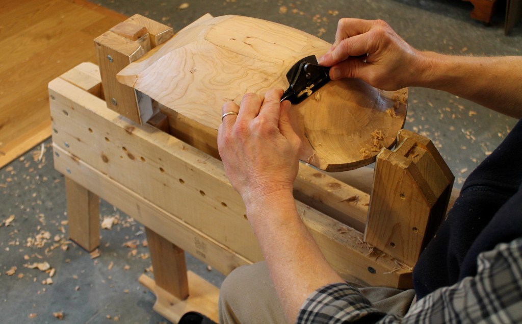 After paring the final surface of the hollow, I plane the foot flat since it moves during drying. Then I redraw the perimeter of the foot and do the final shaping of the exterior from that edge. This bowl design has four distinct exterior surfaces or “panels” as I sometimes call them. In the photo above, I’m using a spokeshave to finalize the form of the end panels. The junction between the side panels and the ends are a key visual feature.