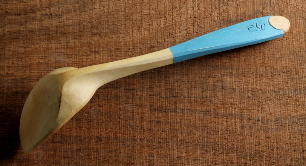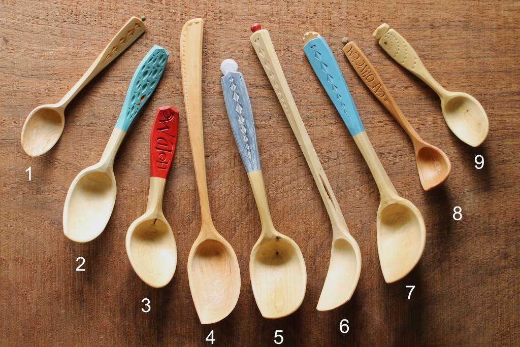A little more color in this group, partly because of the wood species of the crooks I found and partly because I was itching to experiment more with milk paint. So, all of the paint on these is milk paint, then the whole spoon treated with pure refined linseed oil and kiln-cured. All surfaces are straight from the knife except for the inside of the bowl of #8.
