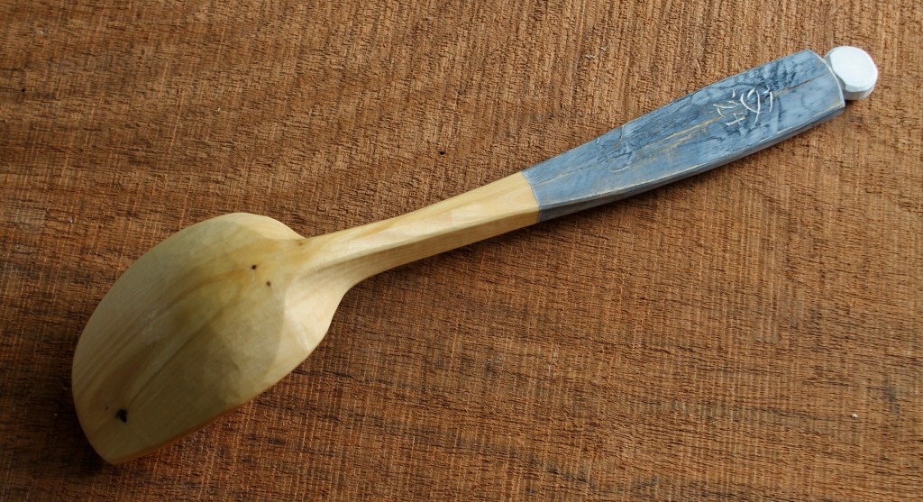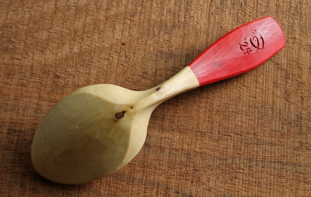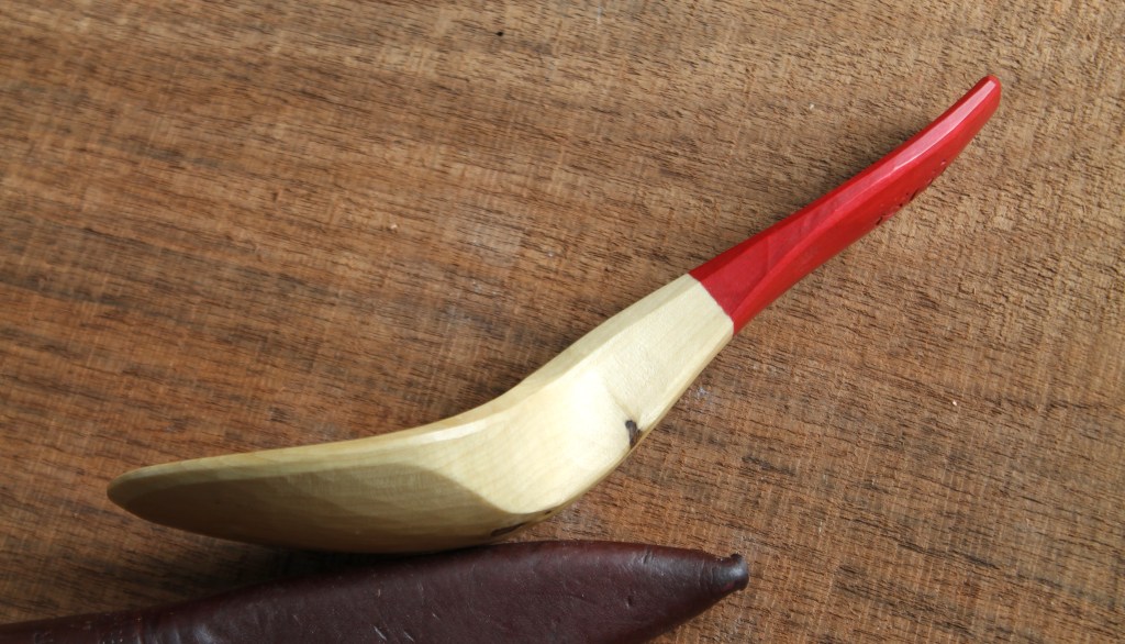 #1: Cherry (sapwood) Eating Spoon, 7 1/2″ x 1 3/16″. With a little green finial. $110 includes shipping. SOLD