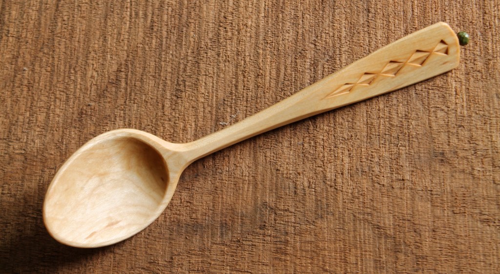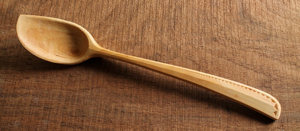 #4: Cherry (sapwood), 12 1/2″ x 2 1/8″. A nice cooker/server with a tapering line of chip carving wrapping around the back end of the handle. $160 includes shipping. SOLD