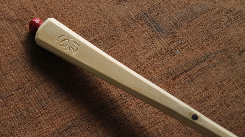 #6: Red Maple, 12″ x 1 7/8″. A slender server/ladle with a red ball finial. $150 includes shipping. SOLD