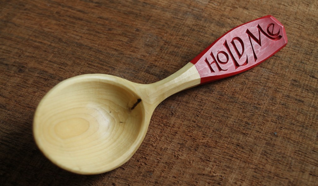 #8: Sugar Maple, 7 1/4″ x 1 1/2″. This one came from a tight little crook. As I started carving it, I was wondering what such a small ladle form could be used for. The thought of dipping olives from a jar or bowl was what came to mind. The lettering and finial followed. The hard maple holds the detail of the small letters well. A quirky little spoon for sure. $190 includes shipping. SOLD