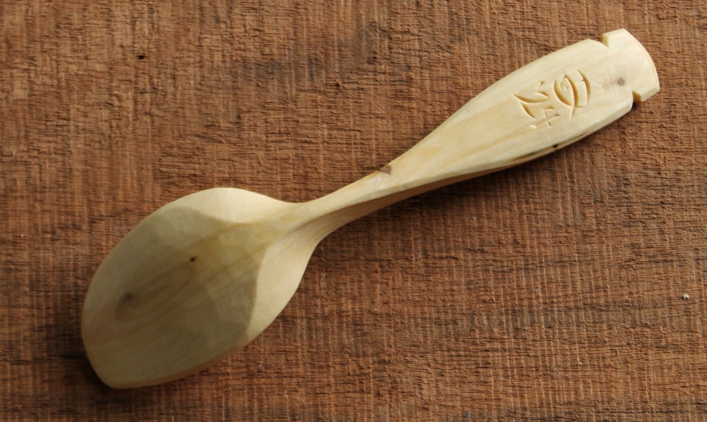 #9: Magnolia Eating Spoon, 6 1/2″ x 1 1/8″. It was the pin knot on the handle of this short eating spoon that sparked the chip-carved design. Like ripples on a pond. $120 includes shipping. SOLD