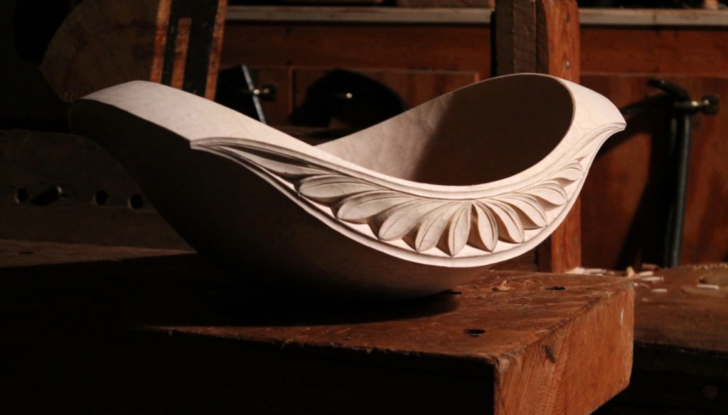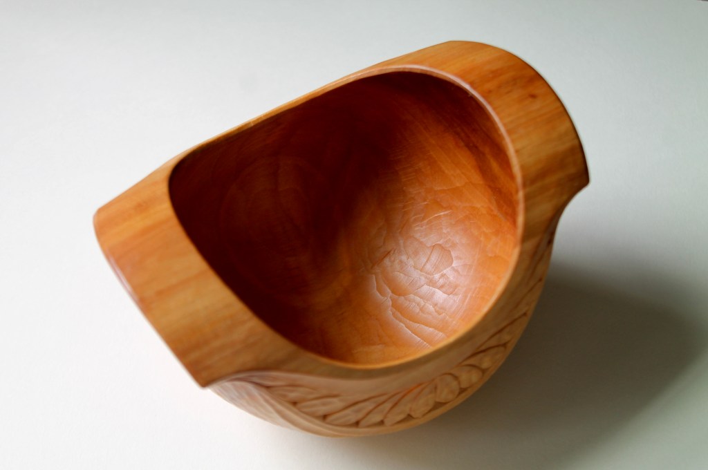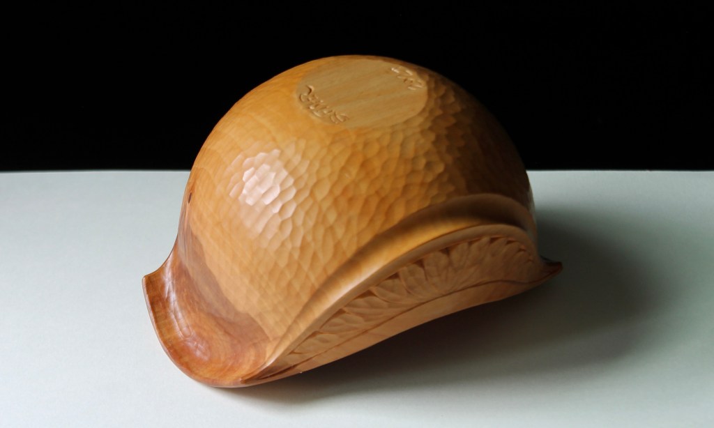 Back to the leaves. I first drew up and carved this general pattern for the side panel of the bowl above in 2015. The concept of a carved “side panel” came to me from seeing Bengt Lidstrom‘s bowls. I have no idea what Bengt called that area of his bowls. If he did have a name for it, I’ll bet it was in Swedish.