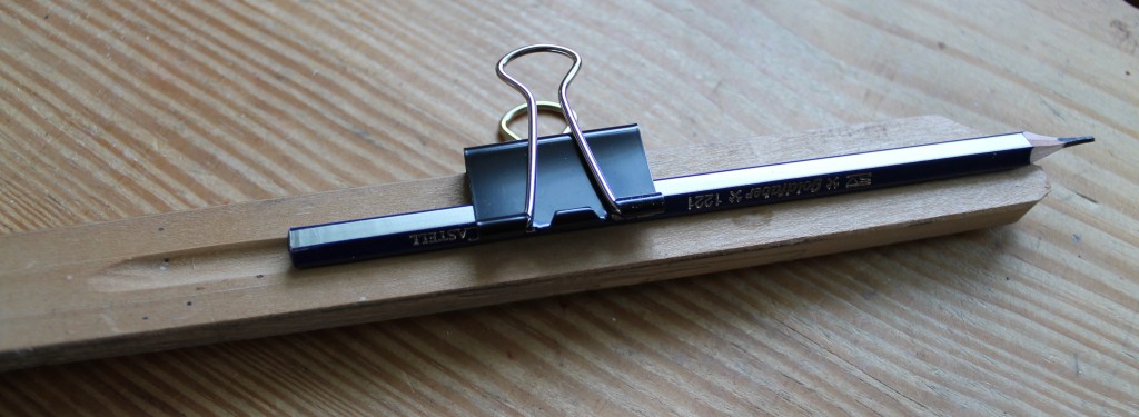 I carved a groove along the outer face of the other leg. A common paper clamp holds the pencil firmly in the groove.