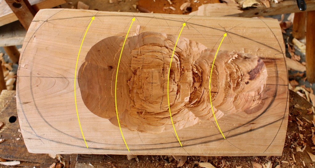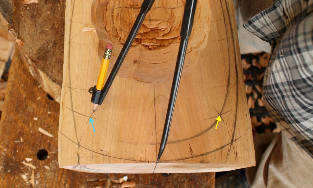 In my last post, I wrote about redesigning a bowl after I had already begun to excavate the hollow. The first thing I did was to relocate the center down in that recess somewhere. If you zoom in, you can see some pencil lines struck from the compass. I started by guessing a little over half of the distance and striking the arcs at the yellow arrows. Then I could easily estimate the distance between them and reset the compass to strike the lines indicated by the blue arrows. I did the same from the sides to determine center at the red arrow. Unlike straightedges, compasses reach over obstructions.