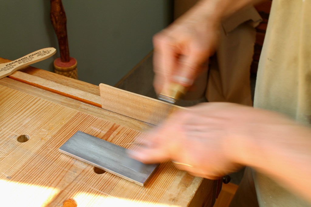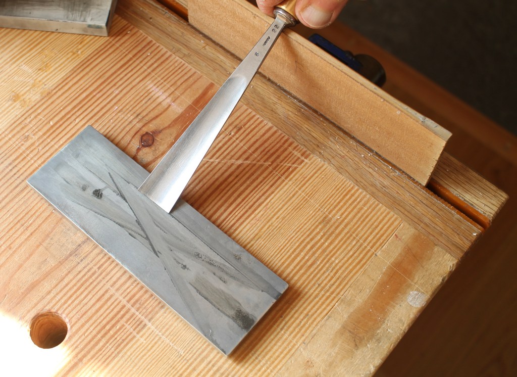 Here I’m honing a vintage spoon-bent carving chisel with the same method. No sweep at all to the edge, so I just held it flat while sliding it, like a chisel. Due to the configuration of the tool, I’ve raised the board up. Notice the series of parallel lines I marked on the board to aid registration in the vise.