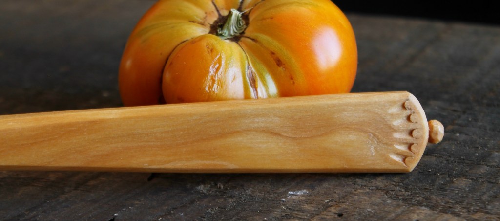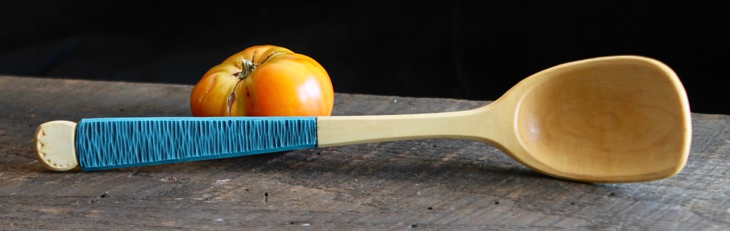 #3: Maple, 11 1/4″ x 2 1/8″. Another good general use spoon. A little more crank than the cherry one above. The handle was textured with a narrow gouge then painted with artist-oils (linseed oil and pigment), black over blue. $140 includes shipping. SOLD