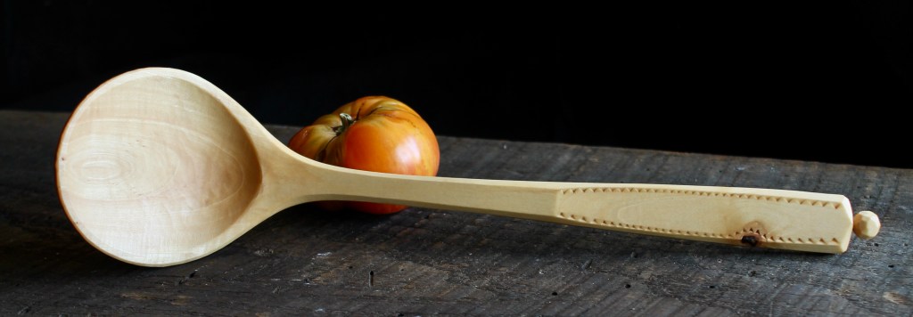 #1: Maple, 12 1/2″ x 3″. The shape of this maple crook called for a ladle with a wide shallow bowl. The second photo gives a better indication of the relatively tight bend from handle to bowl. You can reach deep into the pot. Chip carved handle. $150 includes shipping. SOLD