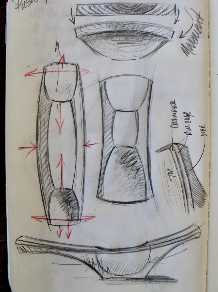 I wanted to keep a lot of that heartwood streak. Long “handles”, like in the Bowl-from-a-Plank design, would allow for that. But this piece of wood wouldn’t fit that exact design. So, I thought about distorting the Bowl-from-a-Plank design, much like you could distort an image of Snoopy from the Sunday comics with Silly Putty. The sketchbook page above reflects some of this mental Silly Putty stretching. The bowl with the red arrows is the Bowl-from-a-Plank (underside), and the rest represent the design for this bowl.