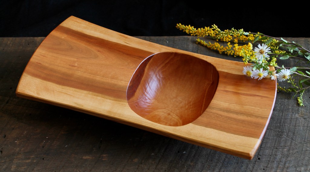 The layout for this one is just freehand sketching. A spoon-bent gouge was needed to shape the steep tight hollow. The hollow itself is 4 1/2″ x 3 3/4″, a nice size for candy or olives.