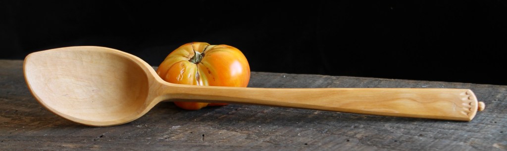 #2: Cherry, 12 1/2″ x 2 1/4″. This is a good general use kitchen spoon for stirring, cooking, serving or whatever. Carved from the sapwood of a black cherry crook. Handle detail below. $150 includes shipping. SOLD