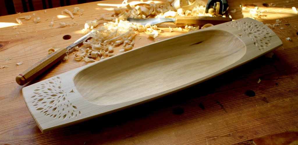Departing from the tree design I’ve carved on the other Bowls-from-Planks, I carved an excerpt from an Emily Dickinson poem on the handles.