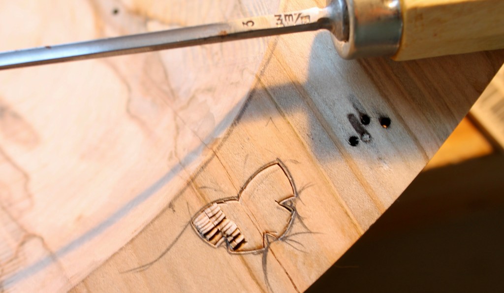 I cut and filed three different sized butterflies, about 1/4″ thick. I traced around each inlay with a finely-sharpened pencil, then excavated the wood. I worked mainly with a narrow shallow gouge to first sink a perimeter just a little inside the lines, then break up the wood with a series of stabbing cuts, then plowing the chips out with the gouge. A couple times, then trim up to the pencil line, leaving the line. Some glue, then tap the butterflies down in. After the glue dried, I shaved and scraped them flush to the surface.