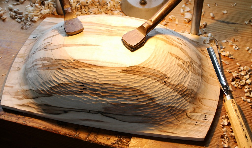 Seeing the abundance of streaks, I wanted to make the most out of this ambrosia maple log, so I resisted cutting off much end grain. As I shaved away gleefully on a breezy day, I noticed a couple narrow cracks working their way in from the ends of the handles (not long after the photo above was taken).
