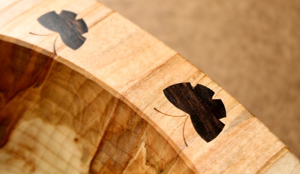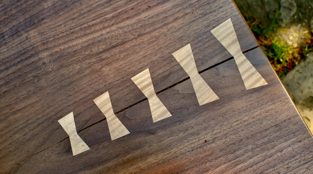 When it came to the top of the handles, I wanted to add some mechanical assurance against those cracks ever opening up. A method I’ve used before is inlaying the classic butterfly keys, also known as bowties or dovetail keys.