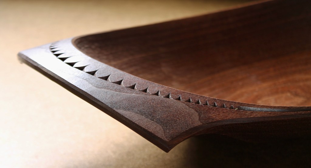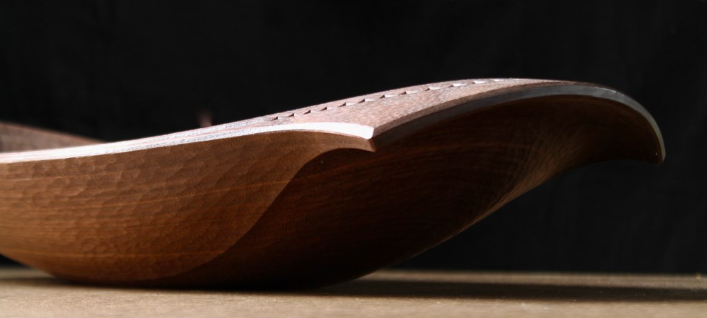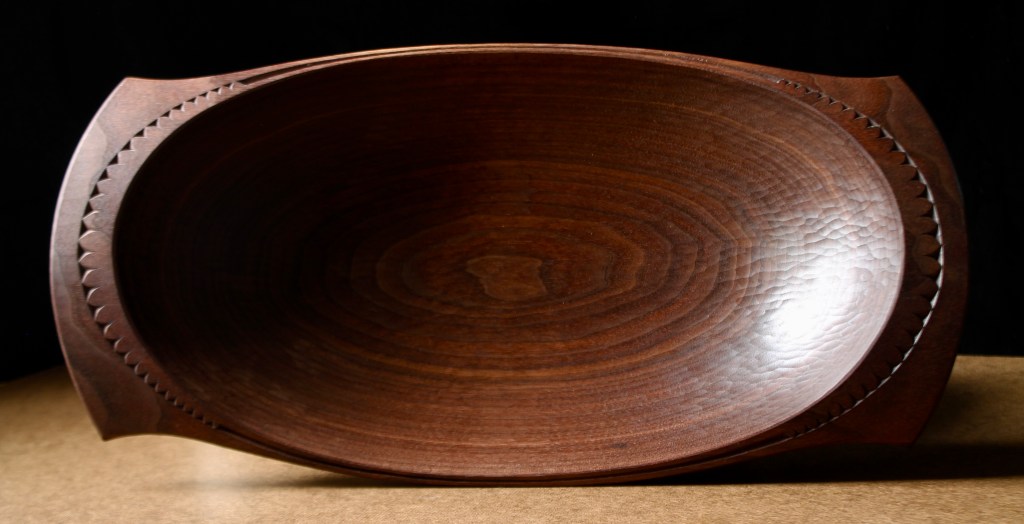 Here’s the top side. The bowl is 20″ long, 10″ wide, and 4″ high. (51cm x 25.5cm x 10 cm) Black walnut. This one is for sale. $1150 includes shipping. If you are interested, please email me at dandkfish@gmail.com. There are a couple more photos below. SOLD
