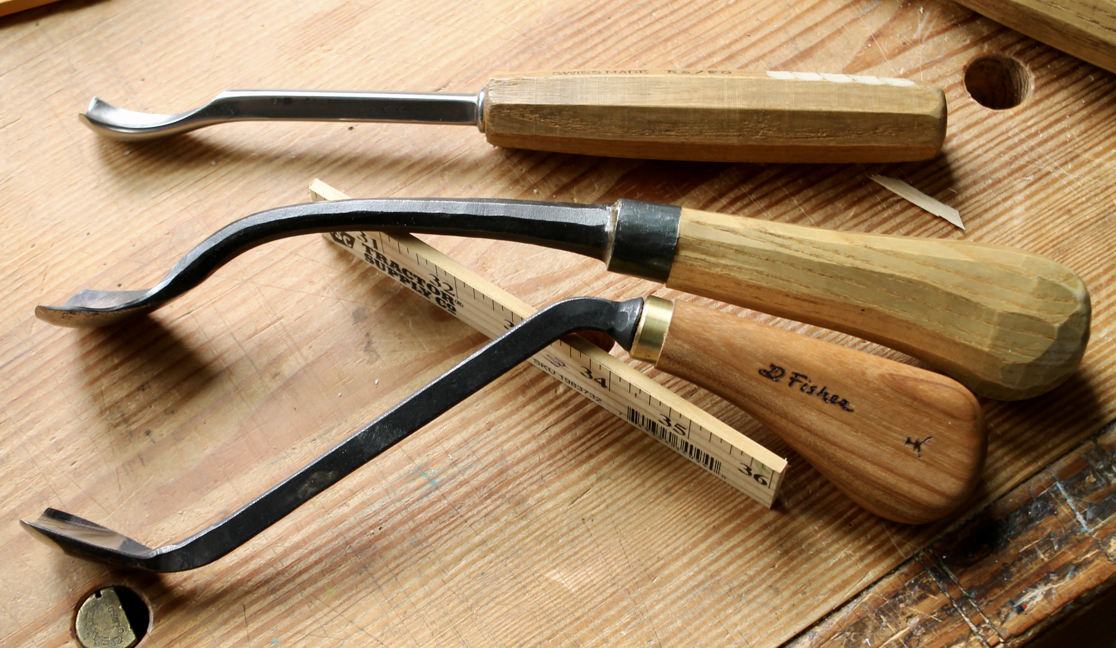 Tools in the spoon-bent sort of range come in all sorts of varieties and shapes. Here are just three. A standard spoon-bent gouge from Pfeil, a swan-neck gouge from Nick Westermann, and a dog-leg gouge by Hans Karlsson.
